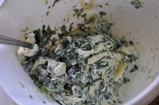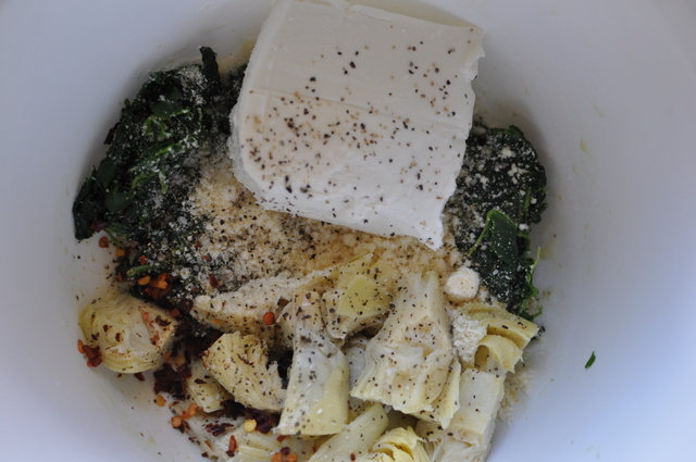 1/2 can artichoke hearts, crushed red pepper, salt , Parmesan, 4 oz cream cheese, and one thawed and drained box of chopped spinach.