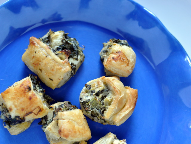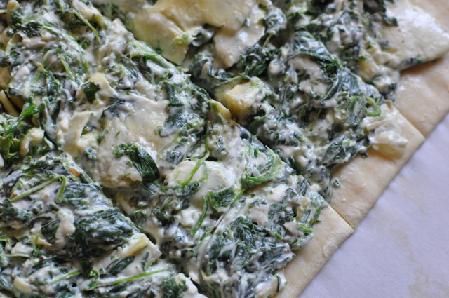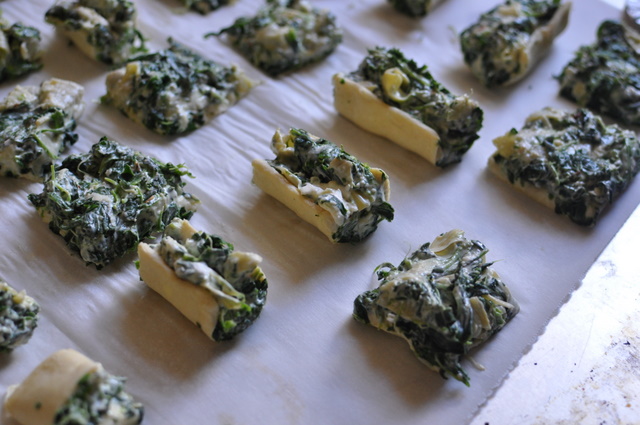 I had more spinach, and made more of the mixture from the egg and spinach cups. This time, I added a few chopped up artichokes, and spread it on a puff pastry sheet. I thought it would make a nice snack/side dish appetizer. Some of them did.