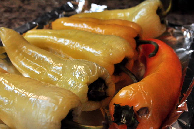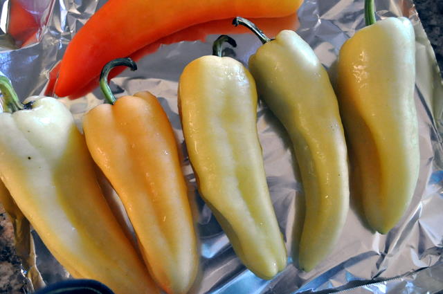 - Brush the peppers with oil and roast in a preheated 375 oven for 6-8 minutes, or until wrinkles. Set aside and allow to cool.