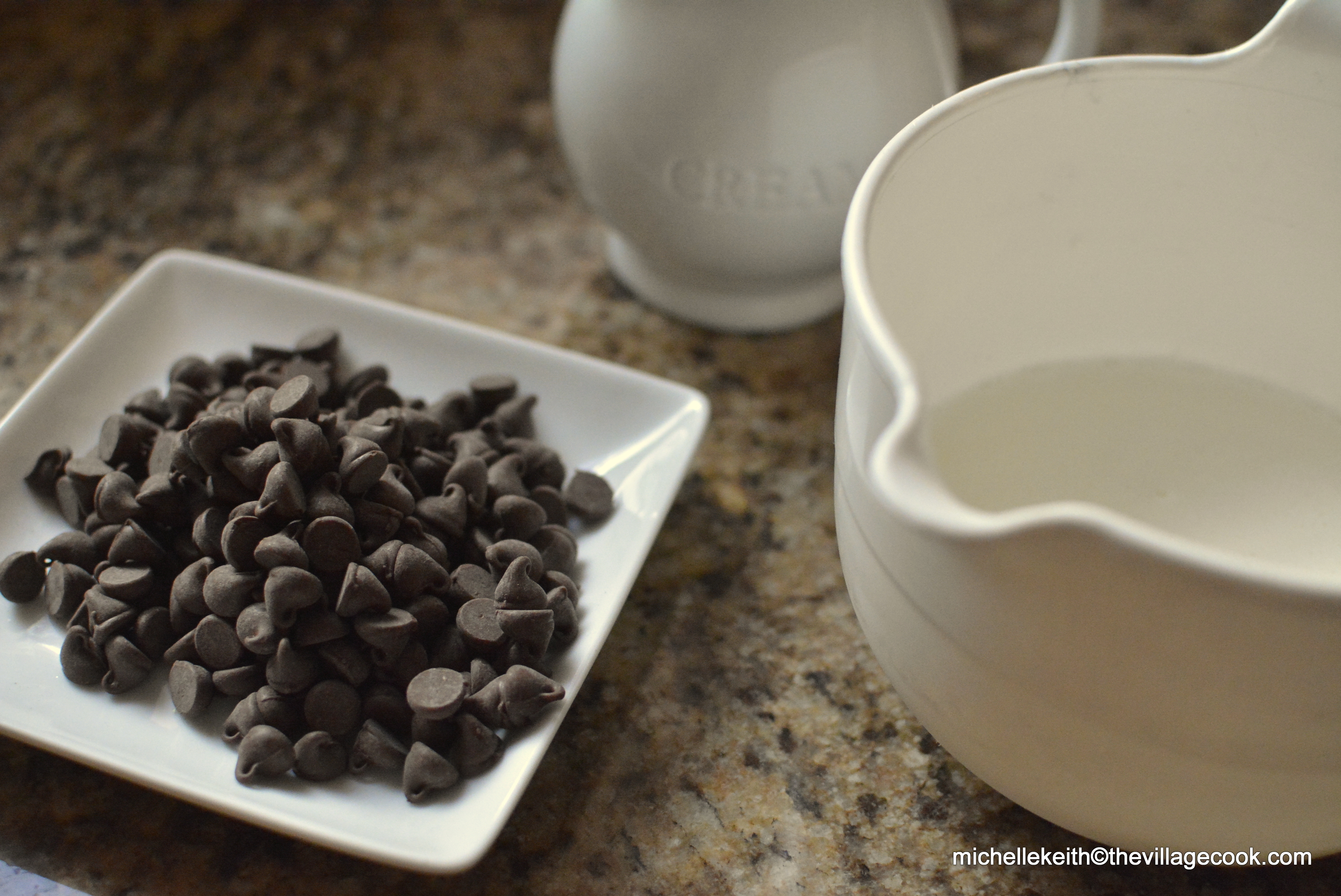 To make this: You need quality chocolate: chips or a grated bar. (12 ounces) Heavy Cream, vanilla,powdered sugar, and a pinch of salt.