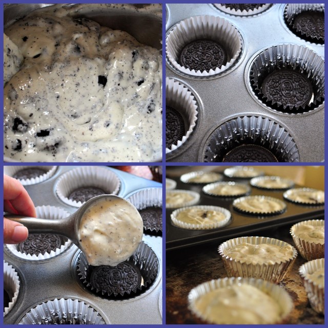 - Line muffin tins with liners, and place one whole cookie on the bottom of each.