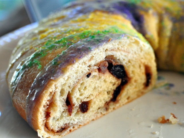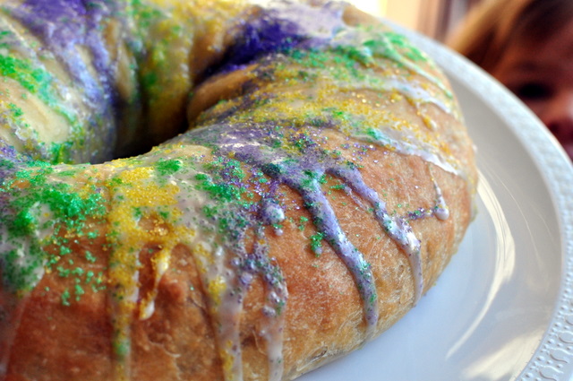 Back to King Cake- a little bit about it, first- it’s a traditional Mardi Gras treat, where a small red bean or a porcelain or plastic doll is hidden inside – whoever gets the piece that has the bead and/or doll is supposed to make the cake the following year. Traditionally the bean or doll is supposed to represent baby Jesus, and King cakes are usually eaten from 12th night through Mardi Gras. So..I think I’m in the clear to eat it. As for the doll- I had the worst time. I found a little rubber doll, but was afraid it may melt in the oven, so I cut a slit in the bottom of the cake after it was baked and placed it in there. I know, I totally cheated.