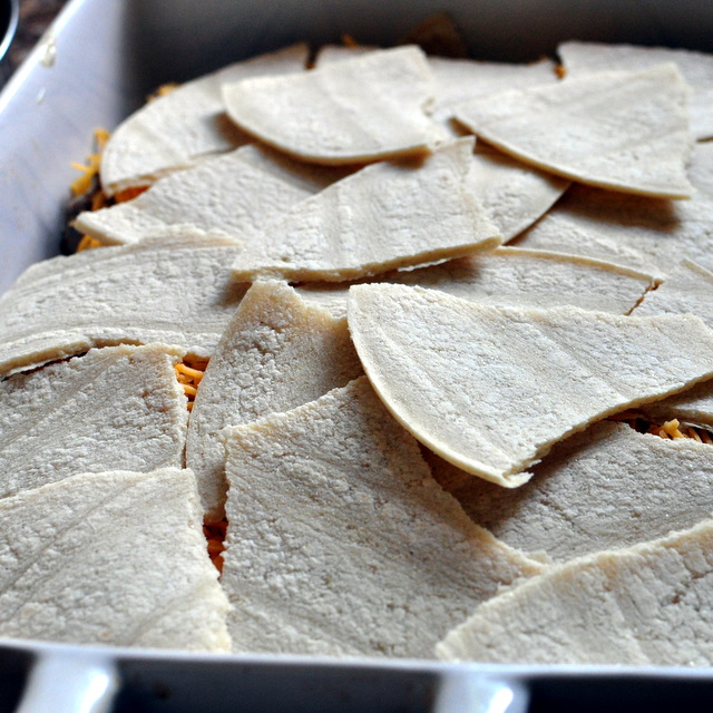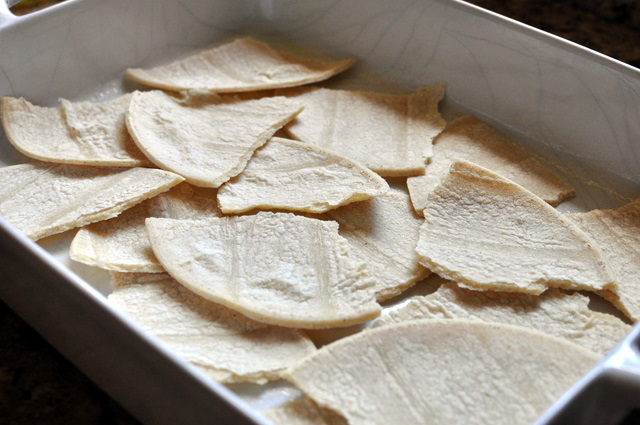 In the directions, it says to tear up 4 corn tortillas and line them on the bottom of a 9×13 dish. I’m assuming it should look like this: