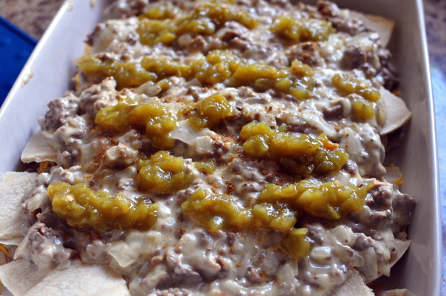easy,huh? Then you place your beef mixture and green chilies on top… next, you tear up some more tortillas…