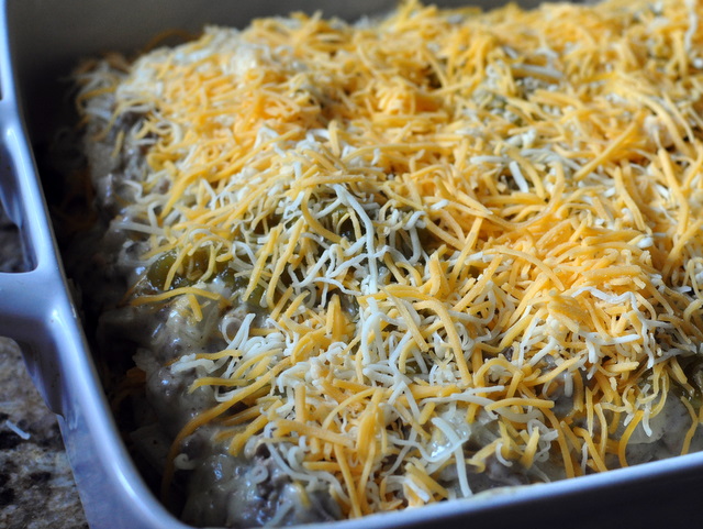 I used this cheddar cheese in between the layers, and the Mexican blend on top. Yum….