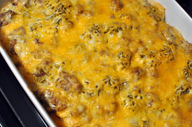 * a few additions and suggestions- when browning the meat, add some cumin and garlic and pepper… about a teaspoon of each…Jalapenos and olives would be tasty on top-I just did the olives, since there were young-uns eating it.;)