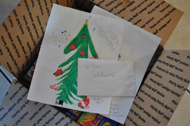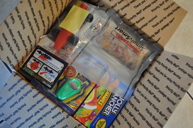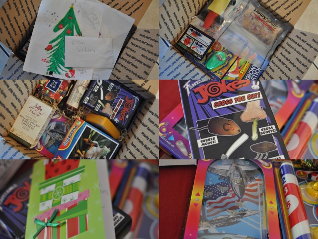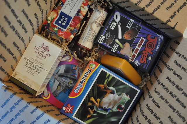 I layered the boxes, on the bottom there are all the flat things, a GI Joe calender, some puzzle books and coloring books…then there’s boxes of  cracker jack, crackers… sausage and cheese, pro-bars, lollipops, homemade cranberry bread…
