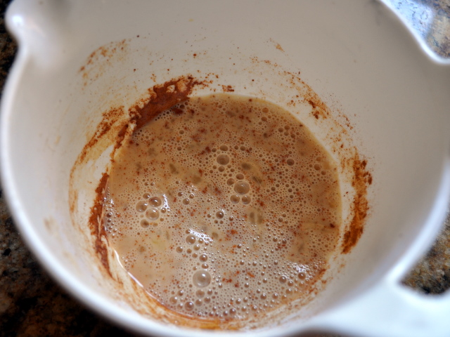 Here is an egg, a splash of milk, a few tbs of sugar, 1 tsp vanilla and cinnamon.